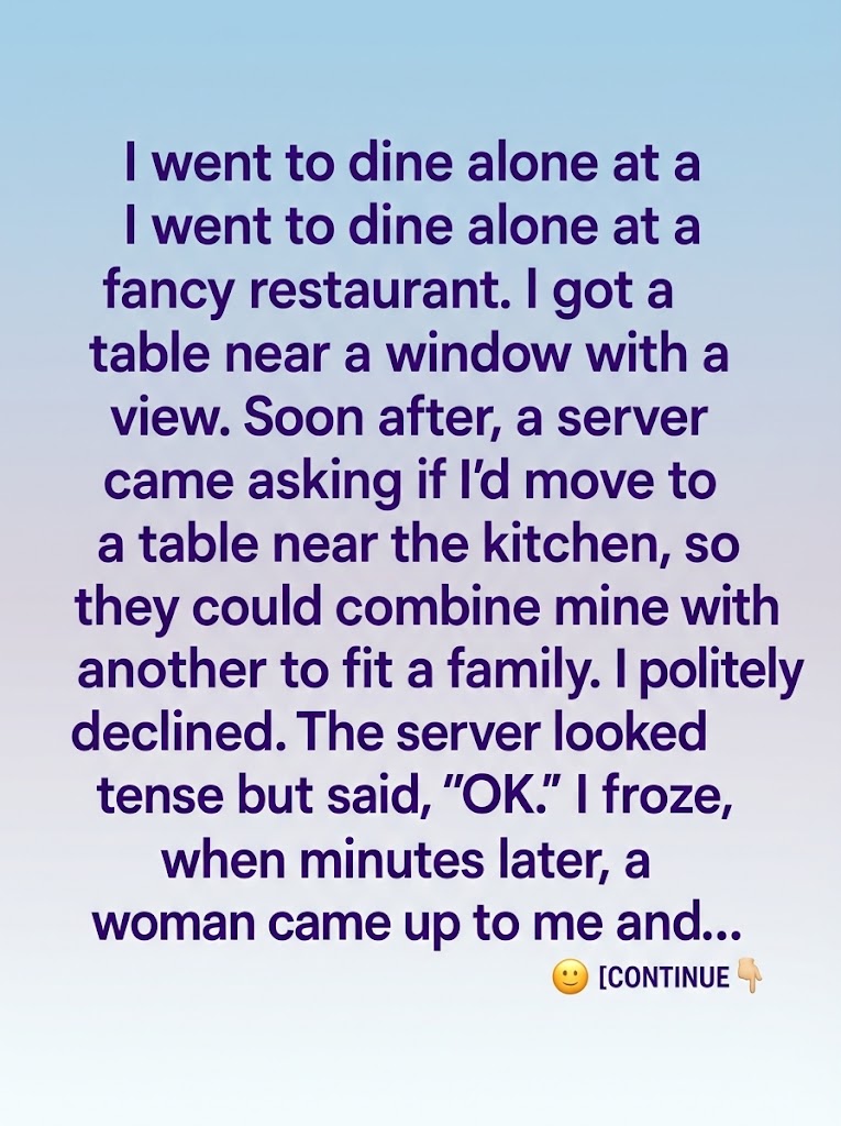 That night. That was the night I learned the true value of dining alone. Not just the quiet peace of it, the freedom from conversation, but something far more profound. Something that shattered my world into a million glittering, razor-sharp pieces.