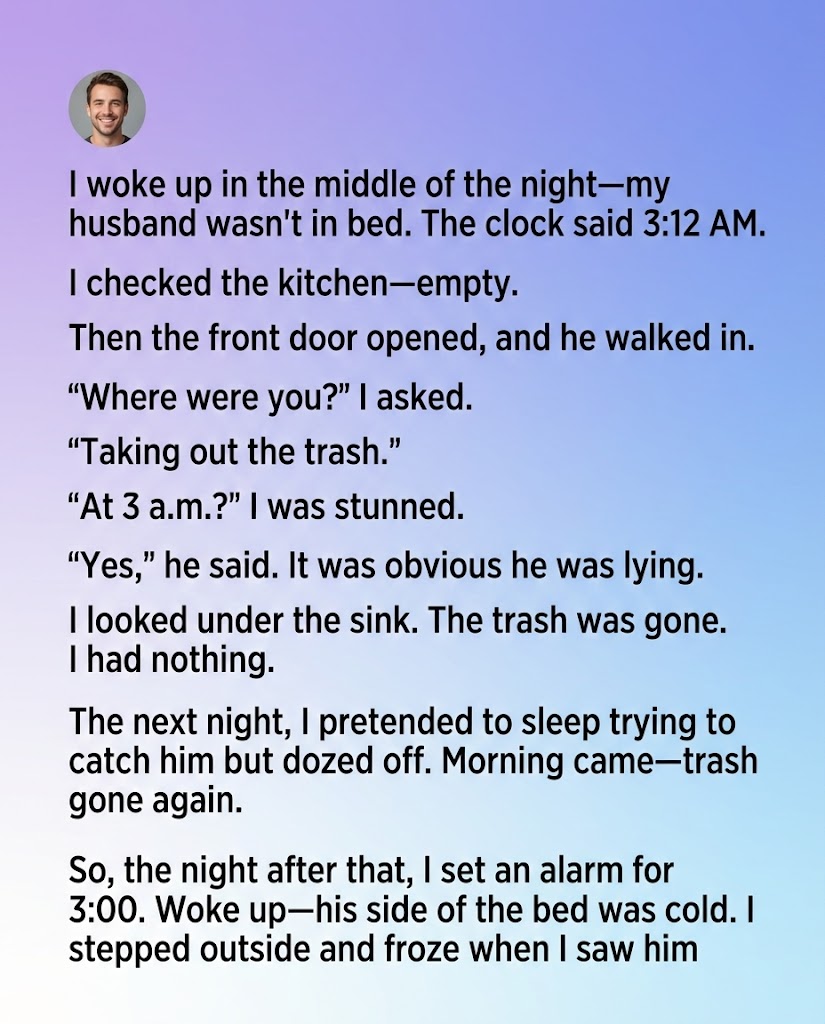 After twenty-two years of marriage, my husband suddenly began taking out the trash at three in the morning. He had never—not once—volunteered for that chore. So why now? One night, I followed him… and what I saw broke my heart in ways I never expected.