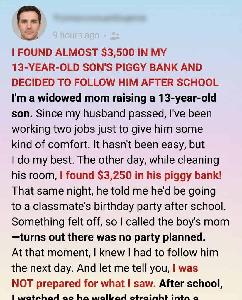 It was a shock I’ll never forget: finding $3,250 hidden inside my 13-year-old son’s piggy bank. My heart froze. Where could he possibly have gotten that kind of money? Determined to uncover the truth, I followed him after school—only to discover something that broke my heart in the most beautiful way.