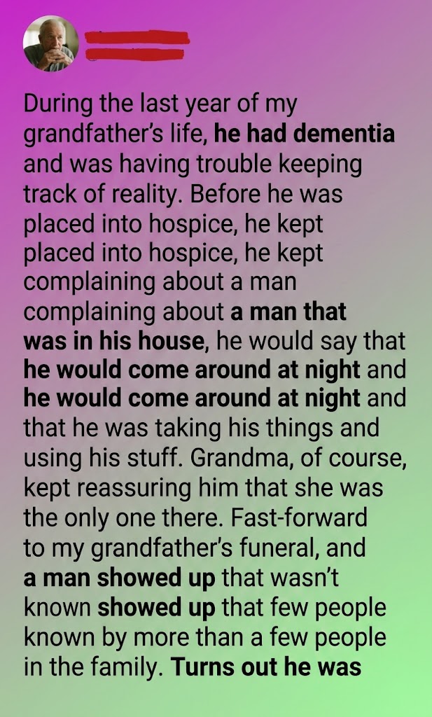 Grandma always handled those moments with patience. She would hold his hands gently and promise him—over and over—that she was the only one there. No one else. Just the two of them in their quiet home. His doctor, convinced that his mind was simply slipping deeper into confusion, increased his medications, hoping to help him stay grounded. But no matter what they gave him, the stories about the “man in the house” never stopped.