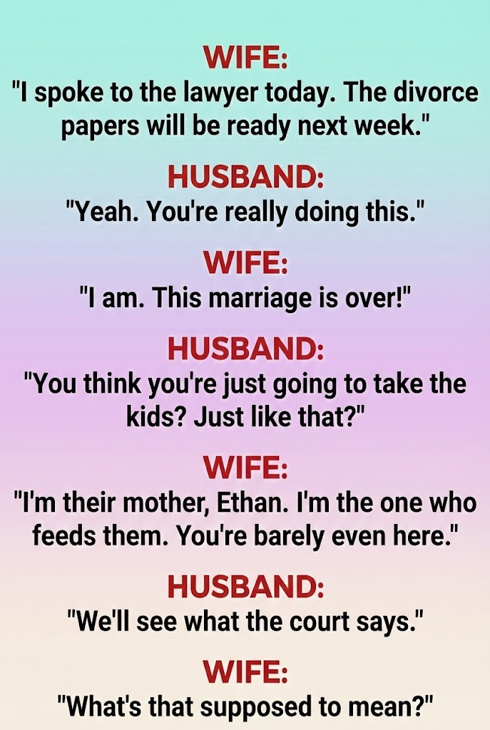 I blinked, stunned. “I’m their mother, Ethan. I’m the one who feeds them. Bathes them. Packs their lunches. Helps them sleep. You’re barely even here.”