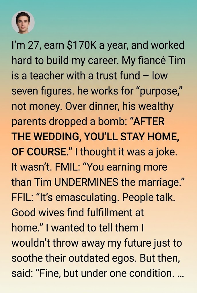 “I currently earn a very good salary,” I continued, looking directly at them. “If I’m to quit my job, I propose that for the first year of our marriage, you match my annual salary – not to give to me, but to donate that exact amount to a women’s empowerment charity of my choice. After that year, if I’m happy with the arrangement and we’re planning a family, I’ll reassess.”