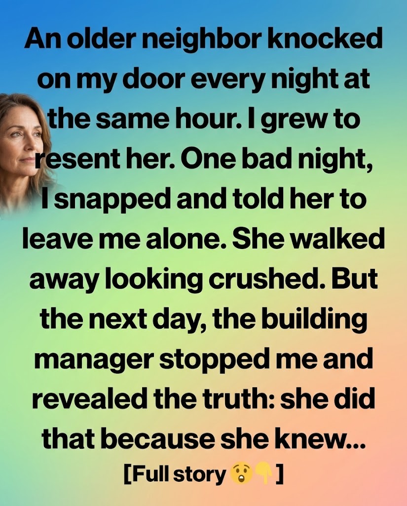 Every single night, without fail, at exactly 9:15 p.m., there would be a knock on my door. Three sharp taps. Pause. Two more. When I opened it the first time, an older woman stood there, hunched slightly, gray hair pulled back into a tight bun. Her eyes were sharp, restless.