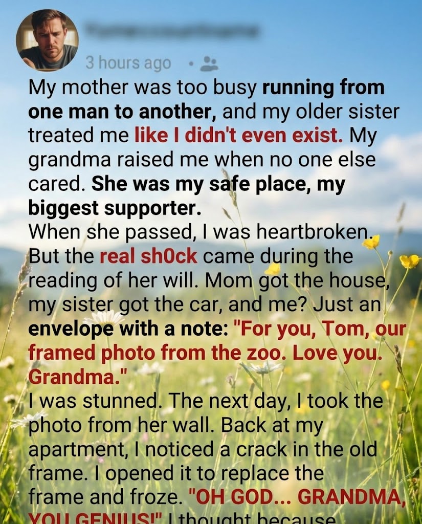 My head spun. GRANDMA WAS MY MOM. The woman who treated me like a nuisance, who never hugged me, who always pushed me away—she was my aunt. MY AUNT. And the woman I had just buried, the one I had mourned so deeply, she was my true mother. My heart broke all over again, for the years I lost, for the truth she couldn’t tell, for the love that was always there, just hidden behind a different title. It was a betrayal so deep, it swallowed every other grievance whole.