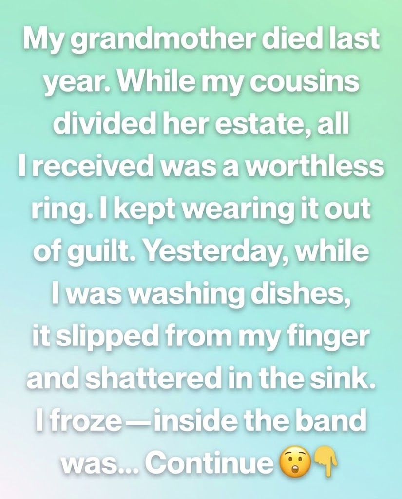 Yesterday, while washing dishes after dinner, my hands were slick with soap when the ring suddenly slid off. I heard it hit the stainless-steel sink with a sharp clink, followed by a sound that made me gasp—a small crack, almost like glass breaking.
