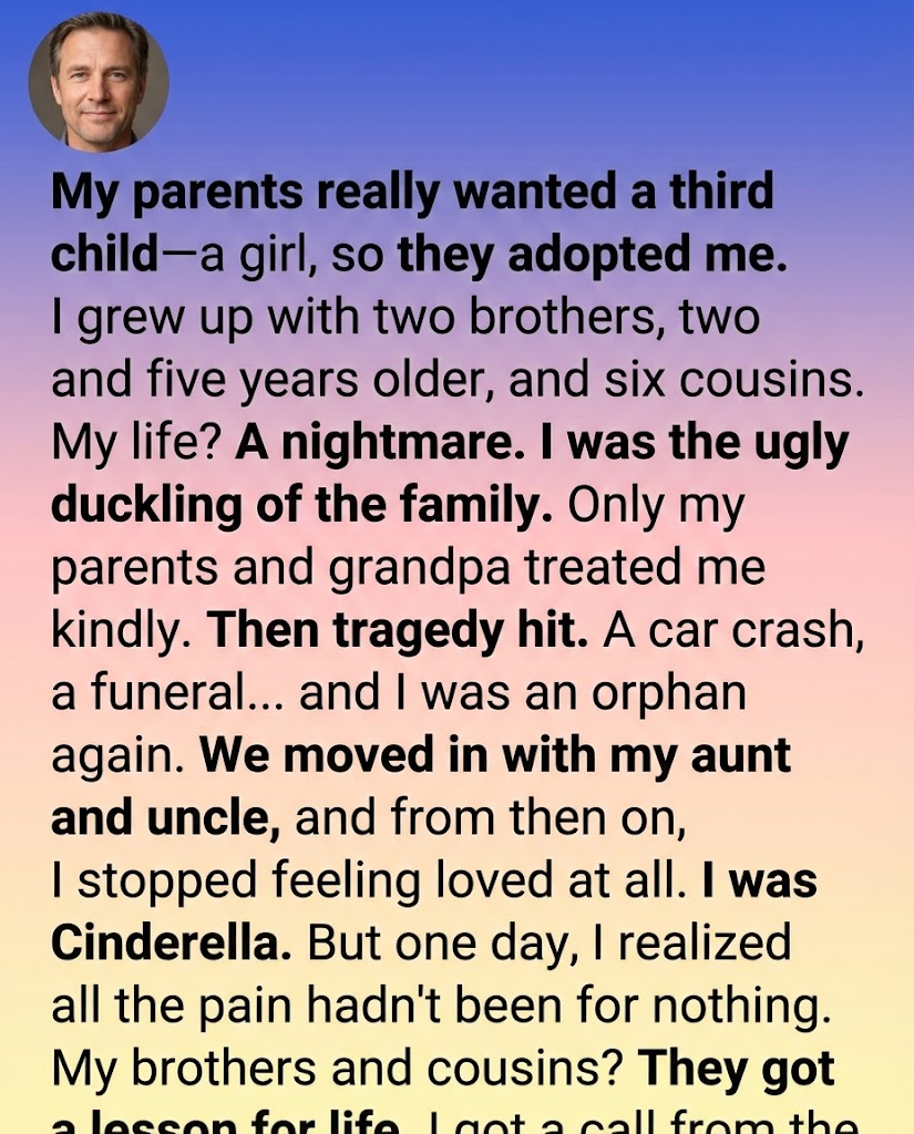 I grew up with two older brothers and six cousins who orbited our home like a loud, glittering universe. But while they shone bright, I always felt like a dim star—present, but unnoticed. My cousins whispered that I didn’t look like anyone. My brothers joked that I was “free,” a bargain-bin addition to the family. I laughed with them, even when the laughter hurt.