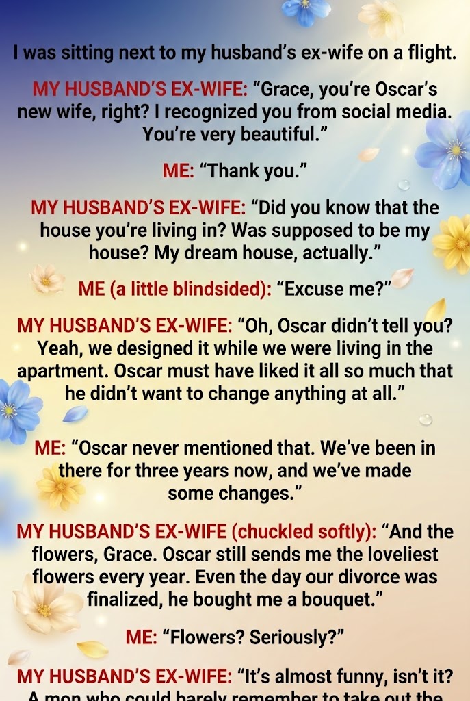 “And the flowers, Grace,” she said softly. “Oscar still sends me the loveliest flowers every year. On our anniversary, and on my birthday. Tulips for both days. He always remembered they were my favorite. Even the day our divorce was finalized, he bought me a bouquet.”