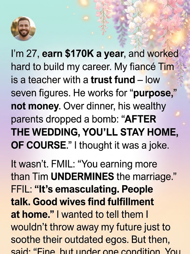 “I currently earn a very good salary,” I continued, looking directly at them. “If I’m to quit my job, I propose that for the first year of our marriage, you match my annual salary – not to give to me, but to donate that exact amount to a women’s empowerment charity of my choice. After that year, if I’m happy with the arrangement and we’re planning a family, I’ll reassess.”