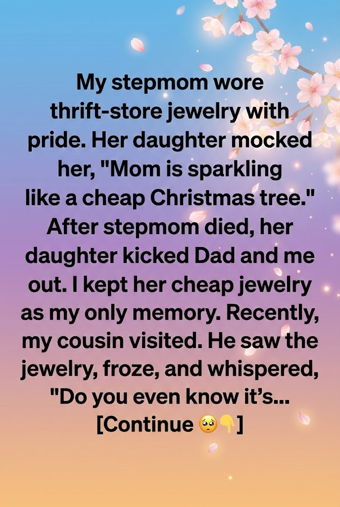 Months later, a distant cousin stopped by our new apartment. He noticed the jewelry box on my dresser and asked about it. I told him everything—about Alicia kicking us out, about my stepmom’s quirky love for cheap accessories.