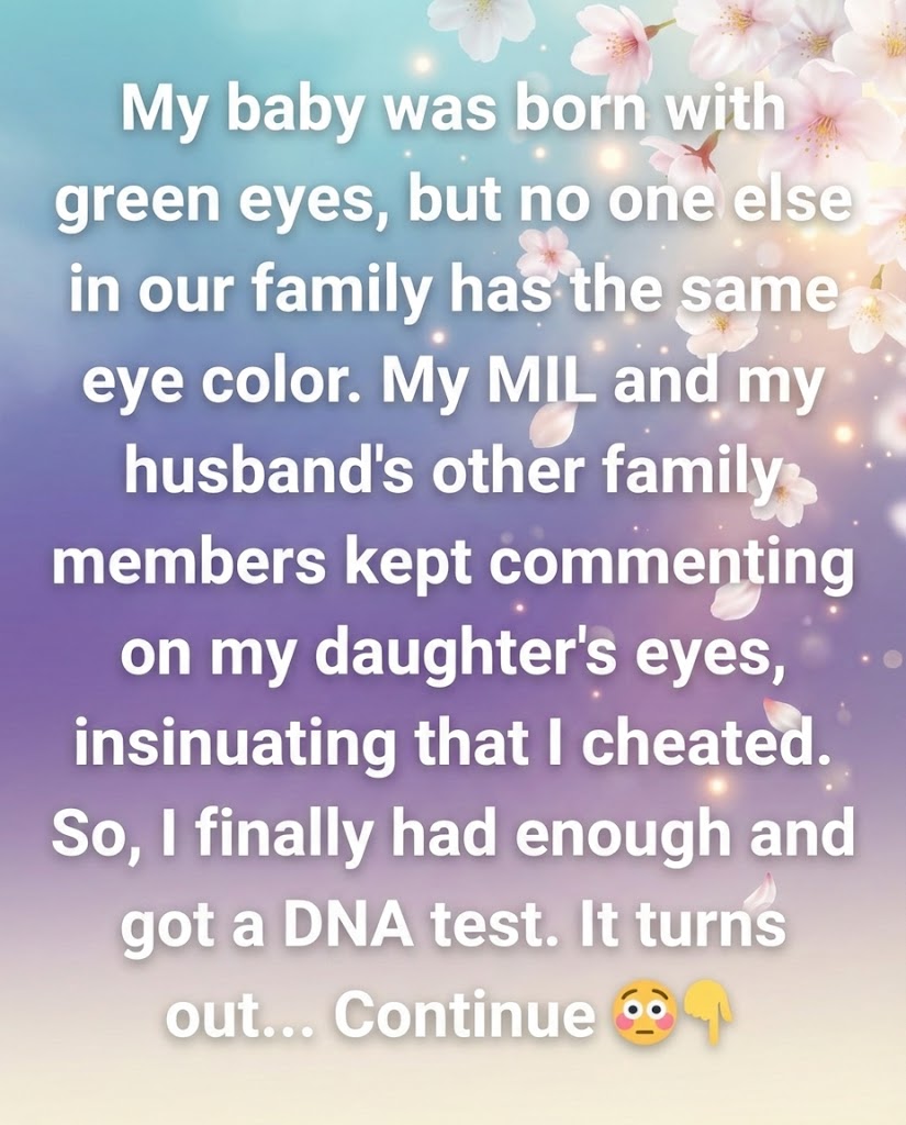 I, a 25-year-old female, gave birth to my daughter 2 months ago and despite my husband (28) telling me he knows I’d never cheat on him, I wanted to give our daughter a paternity test. The reason? She has green eyes and my husband and I both don’t have green eyes, my parents don’t either, and neither do my in-laws — no one in my family has them. My husband said it was probably some weird genetic thing, but I wanted the test for his peace of mind.