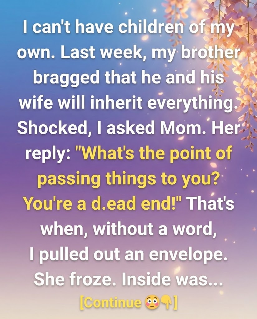 Last month, my brother casually mentioned that he and his wife would be inheriting everything. Confused, I asked my parents about it. That’s when my mom told me flat out: “You chose a lifestyle that ends with you. What’s the point of passing things to you? You’re a dead end!”