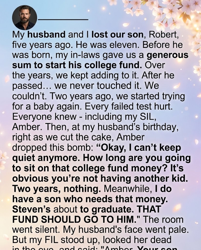 “That money isn’t some forgotten pot waiting to be reassigned, Amber. It’s his memory. It’s Rob’s legacy. Every dollar came from love—birthday gifts, work bonuses, spare change we could have spent on vacations or nicer things… but we didn’t. Because we were building a future for him. A future that never came.”