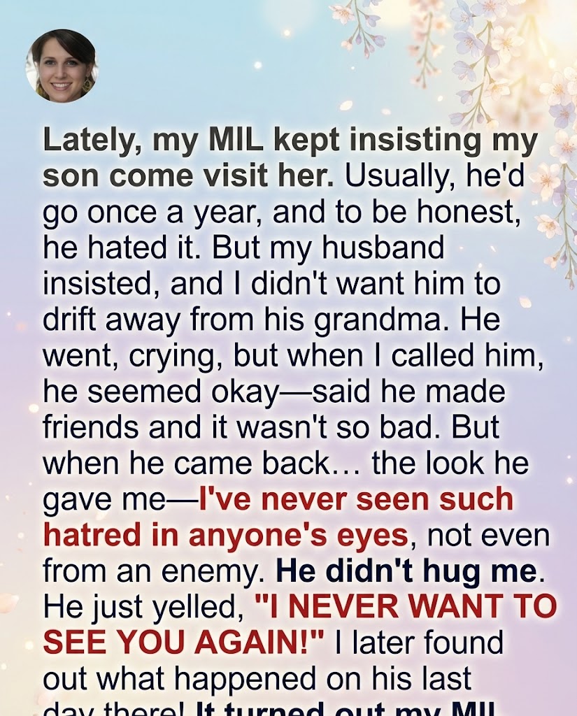 I called my mother-in-law. My hands shook as I dialed. I tried to be calm, but my voice wavered. “Hi,” I started, “just calling about our son. He came back… different. Did anything happen while he was there?”