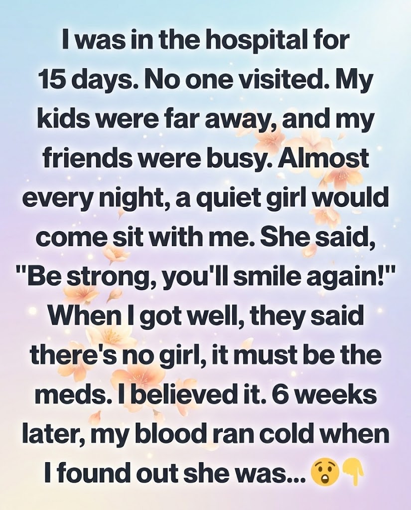 She was quiet, maybe thirteen or fourteen, with dark hair she tucked behind her ears and eyes that seemed older than her face. She never said much. She would pull a chair close to my bed and sit there, hands folded in her lap, as if she belonged. I couldn’t speak, couldn’t ask who she was or why she came, but somehow she understood. She’d lean in and whisper softly, careful not to disturb the room.