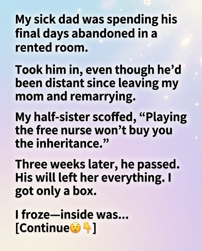 The will was handled quickly. My half-sister took charge—sold the house, moved the money, closed accounts. Everything went to her. I wasn’t mentioned once.