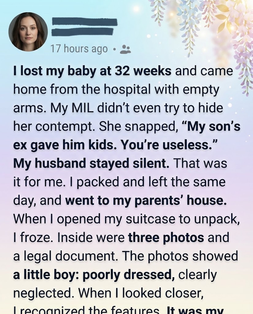 At the bottom of my suitcase were three photographs and a legal document I hadn’t packed. The photos showed a little boy—thin, poorly dressed, eyes too old for his face. In one picture he stood barefoot on a cracked sidewalk. In another, he slept curled against a wall, ribs visible beneath his shirt.