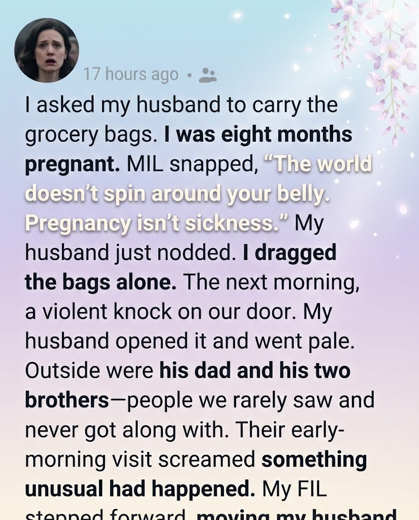 It wasn’t a dramatic request. Just a quiet, exhausted one—my back aching, my ankles swollen, the baby pressing low and heavy. The bags were full of ordinary things: rice, milk, vegetables, prenatal vitamins. Life things.