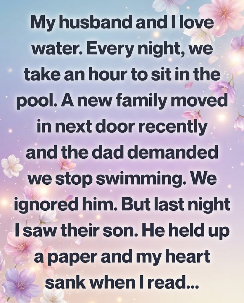 Then one night, as we stood by the pool with towels draped over our shoulders, I sensed movement near the fence. I turned and saw their son—perhaps twelve years old—standing very still on the other side. He didn’t climb over. He didn’t call out. Instead, he pressed a folded piece of paper against the wooden slats and waited.