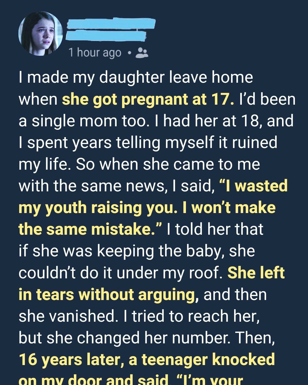 I made my daughter leave home when she got pregnant at seventeen. I’d been a single mom myself, barely eighteen when she was born, and I spent years telling myself that her arrival had trapped me, limited me, stolen what little youth I had left. Instead of healing those thoughts, I carried them like stones in my pockets, heavy and bitter.