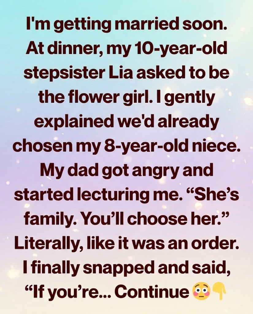 But the second the words left my mouth, Lia’s face crumpled. Her eyes filled, her lip trembled, and suddenly she was crying—big, messy tears that turned the whole table silent. People nearby glanced over. My stepmom rushed to comfort her. I leaned forward too, apologizing, trying to explain that it wasn’t personal, that it had nothing to do with loving her any less.