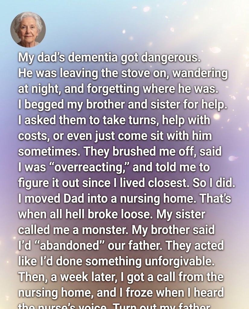 Meanwhile, my siblings suddenly wanted to visit more. They asked for the address urgently, as if this had all just become real to them. When they finally showed up, they still treated me like the villain. Standing in the lobby, they whispered that there was “no need” for a nursing home. That Dad would’ve been fine at home. That I’d overreacted.