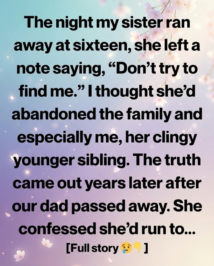 We didn’t see her again for a long time. Postcards came sometimes. A phone call once a year if we were lucky. Mom defended her weakly. Dad never spoke her name. And I grew up with a hole where my sister should have been, telling myself I didn’t need her.