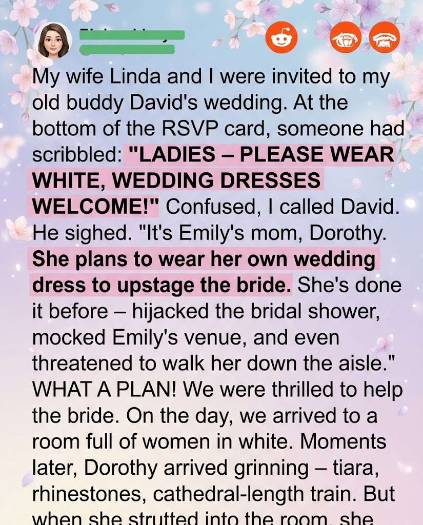 Then I saw her. At the very front row, center. My heart stopped. My breath hitched. The entire room seemed to quiet, a collective gasp that was almost imperceptible, yet deafening to me. She wore white. Not ivory, not cream, not champagne. PURE, unadulterated, blinding white. A flowing gown, elegant, expensive. It could have been a bride’s dress. It was a bride’s dress.