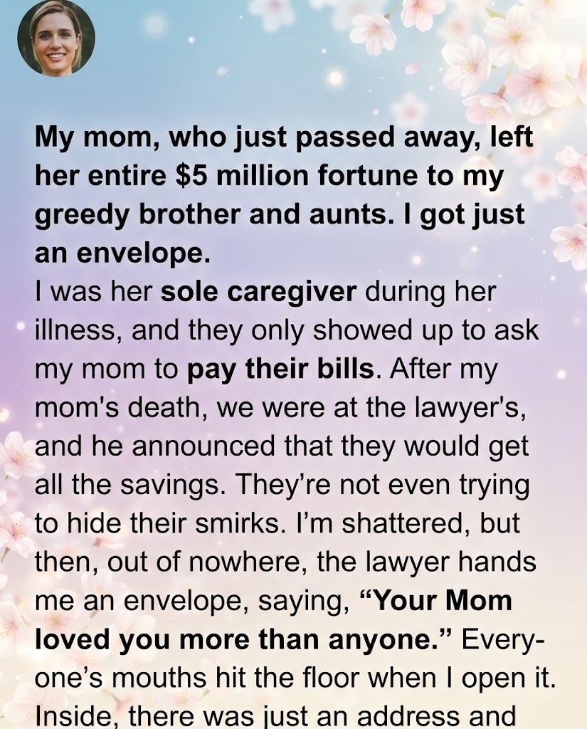 The lawyer cleared his throat, adjusting his spectacles. “And for you,” he said, his voice devoid of warmth, “your mother left… this.” He pushed a plain, cream-colored envelope across the polished mahogany table. No dramatic reveal, no explanation. Just a small, unassuming envelope. That was it.
