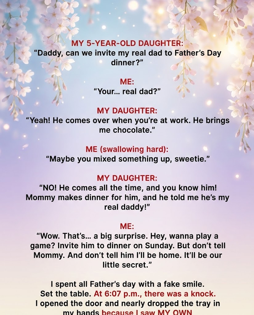 “Daddy,” she said from her booster seat, “can we invite my real dad to dinner? He comes when you’re at work.”