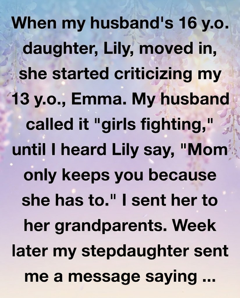 When my husband’s 16 y.o. daughter, Lily, moved in, she started criticizing my 13 y.o., Emma. My husband called it “girls fighting,” until I heard Lily say, “Mom only keeps you because she has to.” I sent her to her grandparents.