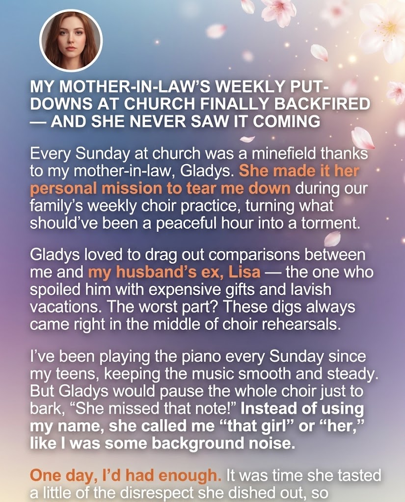 Every Sunday at church was a minefield thanks to my mother-in-law, Gladys. She made it her personal mission to tear me down during our family’s weekly choir practice, turning what should’ve been a peaceful hour into a torment. Gladys loved to drag out comparisons between me and my husband’s ex, Lisa — the one who spoiled him with expensive gifts and lavish vacations.