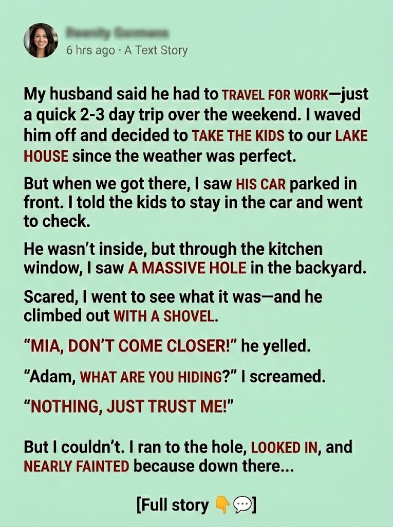 Adam kissed me goodbye, claiming he was off to Portland for a tech conference. I believed him. We’d built a life together—two kids, two coffee shops, and a lake house that held our best memories. But when I spontaneously took the kids to the lake that weekend, I found his car parked in the driveway. And Adam, covered in sweat and dirt, digging a grave-sized hole in our backyard.