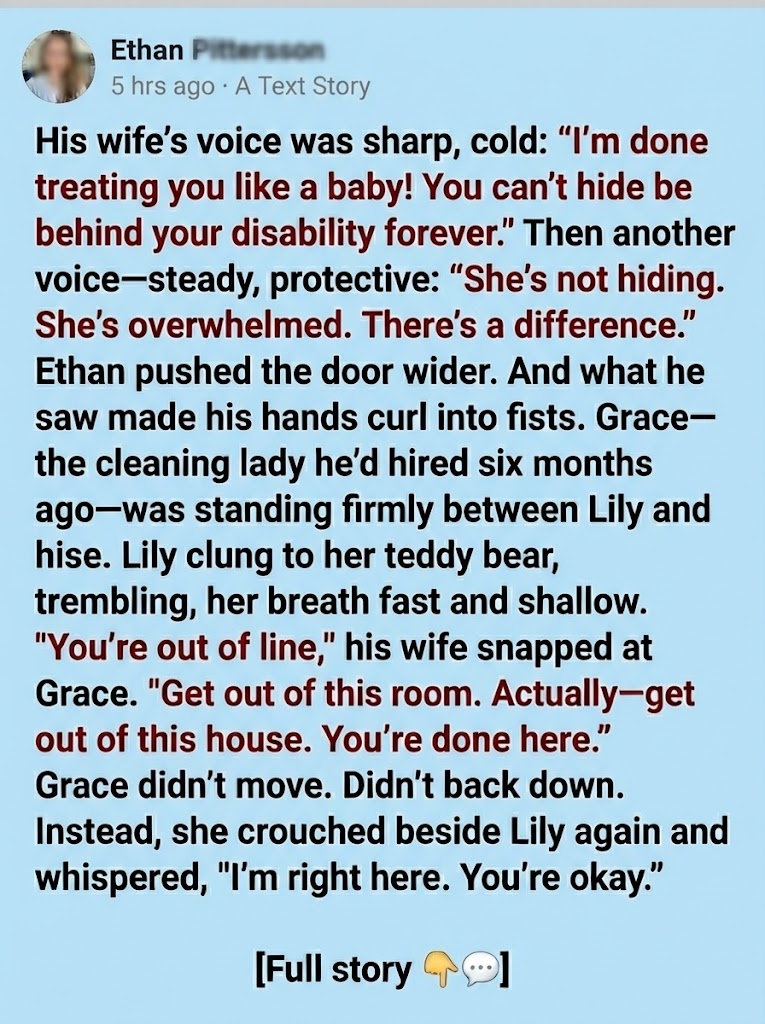 Grace, the cleaning lady I had hired six months ago, was standing firmly between Lily and my wife, Veronica. Lily clung to her teddy bear, trembling, her breath fast and shallow.