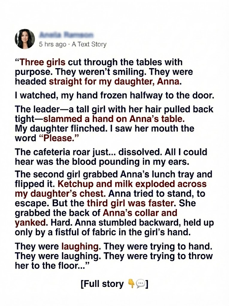 The second girl grabbed Anna’s lunch tray and flipped it. Ketchup and milk exploded across my daughter’s chest.