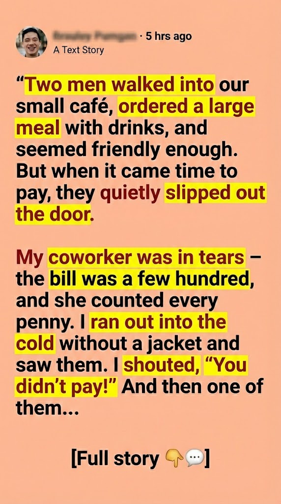 Months passed. The initial white-hot anger faded into a dull, throbbing ache. I still worked tirelessly, still saved every penny, but the memory of those two men, those dining-and-dashing thieves, was a bitter pill I swallowed occasionally. I’d scan faces in crowds, always half-expecting, half-dreading to see them again. What would I even do? Yell? Scream? Demand my money? I didn’t know. I just knew I would never forget.