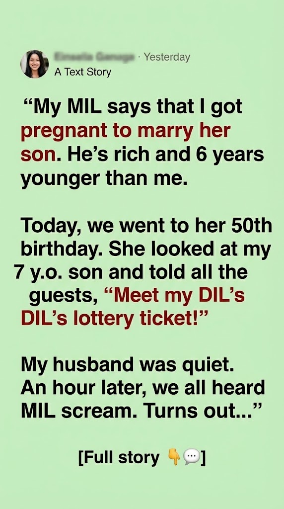 She looked at my 7 y.o. son and told all the guests, ‘Meet my DIL’s lottery ticket!’ My husband was quiet. An hour later, we all heard MIL scream.Turns out…”