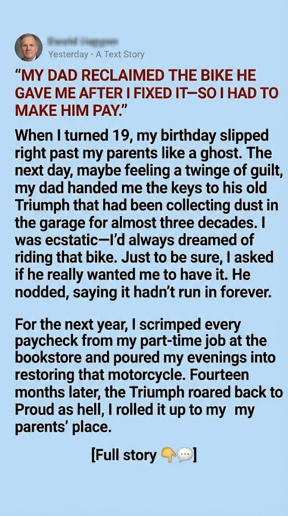 The paper slipped from my trembling fingers, fluttering to the floor like a dying bird. My vision blurred. A sound escaped me, a ragged gasp of absolute horror. He hadn’t just reclaimed the bike; he had reclaimed the last piece of a life I never knew was mine.