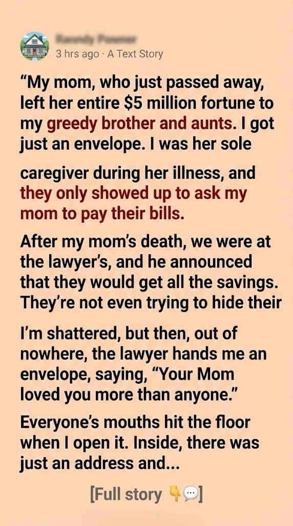The lawyer cleared his throat, adjusting his spectacles. “And for you,” he said, his voice devoid of warmth, “your mother left… this.” He pushed a plain, cream-colored envelope across the polished mahogany table. No dramatic reveal, no explanation. Just a small, unassuming envelope. That was it.