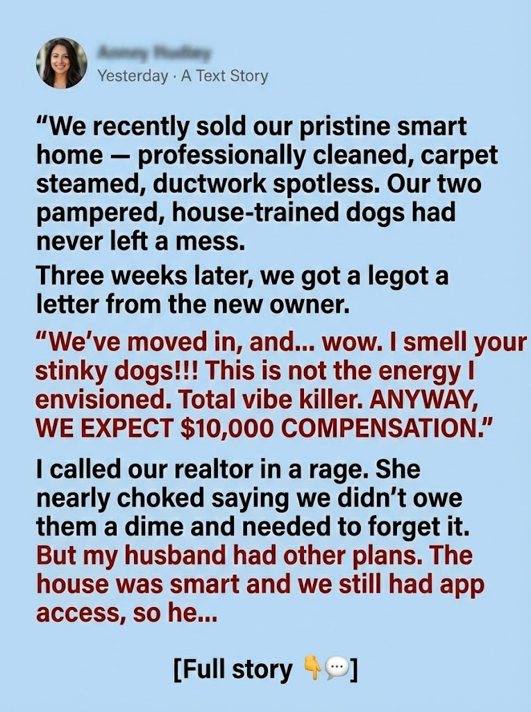 Months later, I ran into her at the grocery store. Frazzled, clutching sage bundles, she muttered, “Sometimes I swear I can still feel… presence.” I smiled, “Maybe next time you’ll think twice before demanding $10K for imaginary dog smells.”