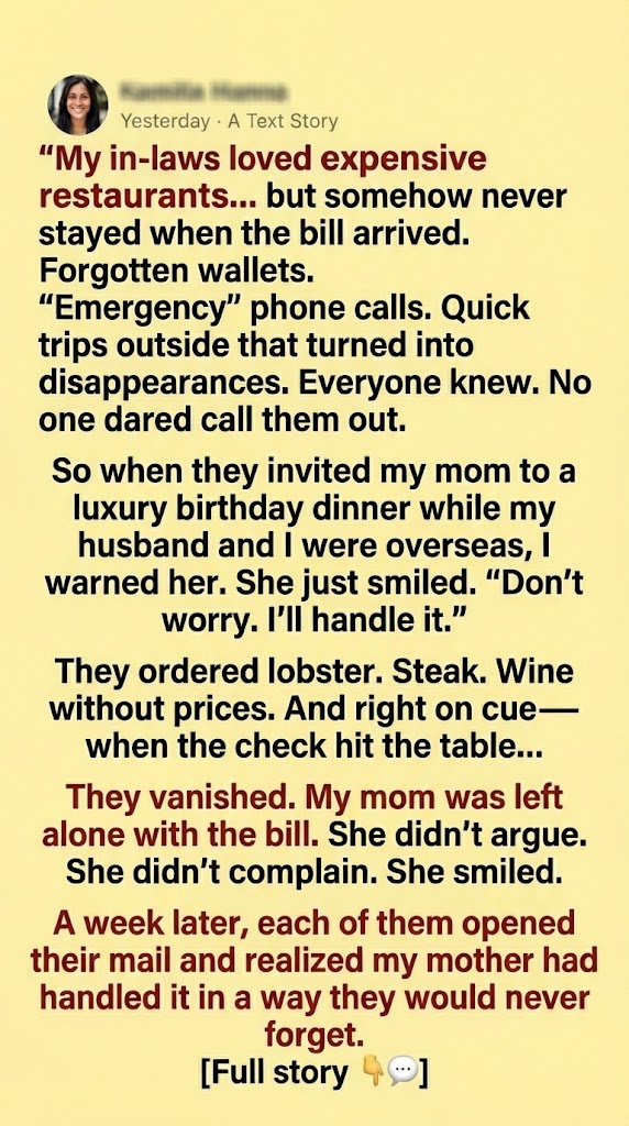 They ordered lavishly. Lobster tails. Premium steaks. Appetizers no one finished. Bottles of wine chosen without even glancing at the price. My mom ordered a modest meal, drank water, and listened politely as the conversation circled around stories they’d told a dozen times before.