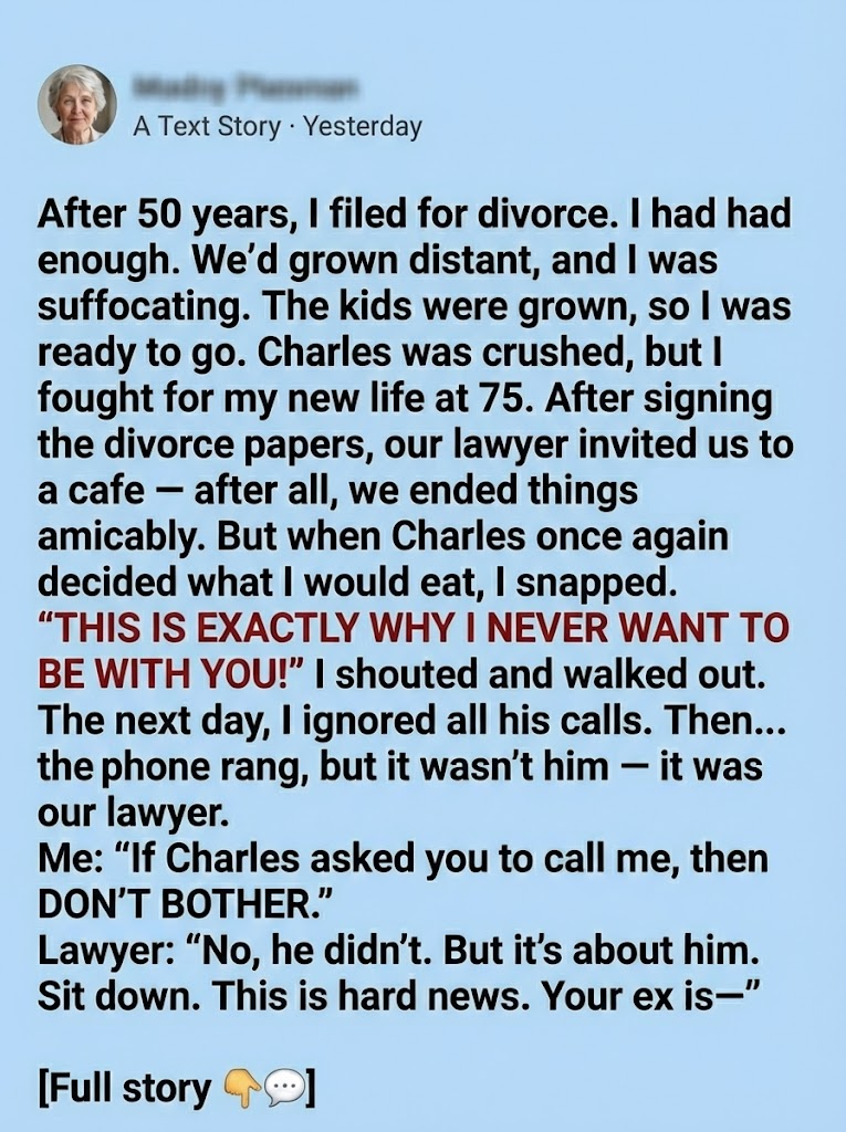 And now, at seventy-seven, I live alone in a small apartment filled with sunlight and color I chose myself. I order spicy food. I take art classes. I wake up every morning knowing my life is finally my own.