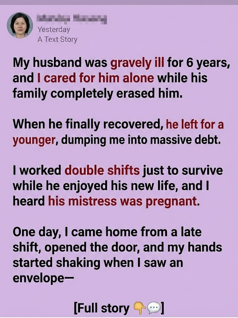 She told me she had left him. She said she would raise the baby alone. Then she explained everything. He had told her our marriage was long over, that I had abandoned him years ago. But one night, she overheard him talking to his mother—laughing—saying that I was the only one who had stayed when he was sick, that I had sacrificed everything while his family turned away.