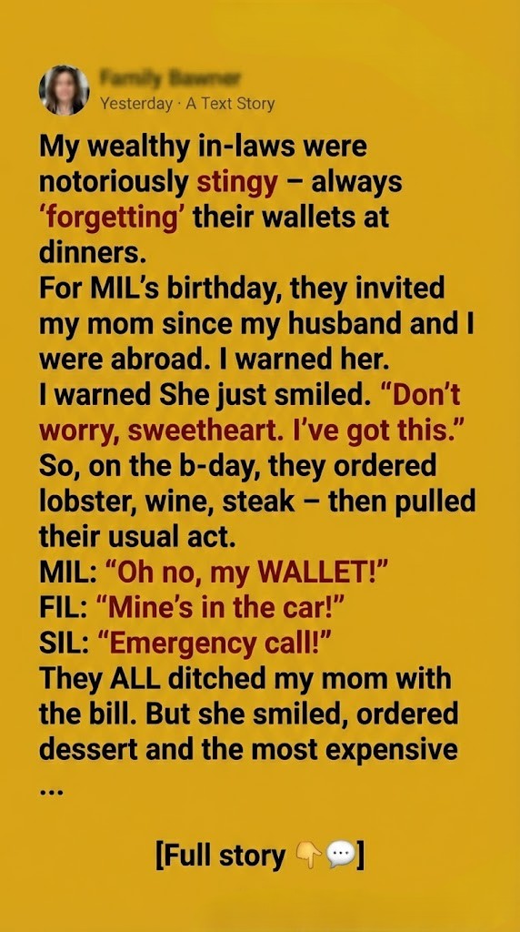 It was their thing. Restaurants, birthdays, family dinners—someone always “forgot” something. A wallet left at home. A card that suddenly didn’t work. An urgent phone call at exactly the wrong moment. Everyone knew it, but no one ever said it out loud.