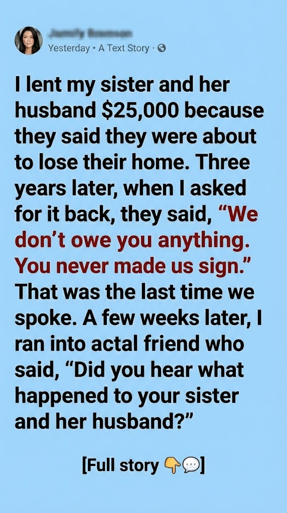 My sister’s voice went cold. Her husband took over the call. He told me they didn’t owe me anything. There was no contract. No paperwork. Nothing legally binding.