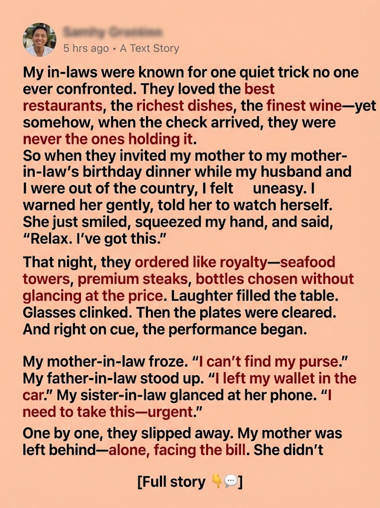 So when they invited my mother to my mother-in-law’s birthday dinner while my husband and I were overseas, I felt uneasy. I warned her carefully, reminding her of their habits and telling her to stay alert.
