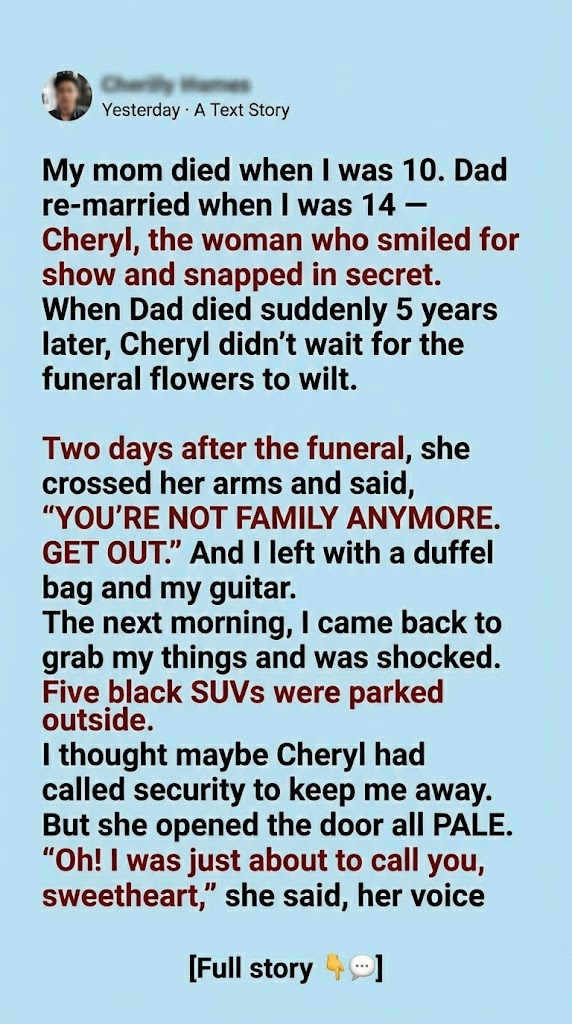 The next day, I pulled up to my childhood home. Five black SUVs lined the curb. Two men in suits stood by the door. My heart pounded—had Cheryl hired security? But when the door opened, Cheryl looked pale, sugar-coating her voice: “Sweetheart! I was just about to call you.”