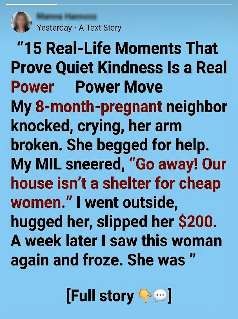 • My 8-month-pregnant neighbor knocked on my door, sobbing, her arm broken. She begged for help. My MIL sneered, “Go away. Our house isn’t a shelter for cheap women.” I stepped outside anyway. I hugged her and slipped her $200—all I could spare.