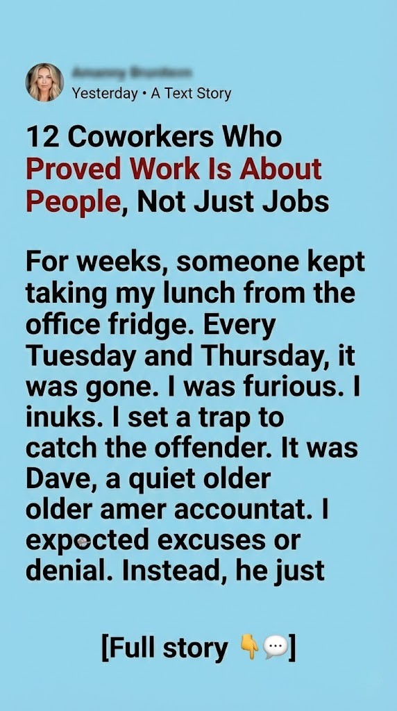 - For weeks, someone kept taking my lunch from the office fridge. Like clockwork, every Tuesday and Thursday, my lunch would disappear before I could get to it. I was furious and set a trap to catch the offender. It was Dave, a quiet older accountant on the team. I expected him to deny it or at the very least make an excuse but instead he just started crying. His wife had dementia. His teenage grandson had just been kicked out and was couch-surfing. Every Tuesday and Thursday, the kid met Dave during lunch. Dave gave him his own meal. Every time. I asked him, “So why take mine?” and he said, “Because I still have to work the afternoon. I was getting dizzy…” Every dollar went to his wife’s care and his grandson. So he stopped feeding himself. I told him to keep the lunch. Next week, I packed two. Told one coworker. She told another. Within a month, food quietly appeared in the fridge on Tuesdays and Thursdays. No announcements. Just containers with Dave’s name on sticky notes. Last spring, Dave’s grandson visited. He’d finished trade school. He brought banana bread and said: “Thanks for feeding my grandpa so he could feed me.” Half the room had no idea what he meant. The ones who knew just smiled.