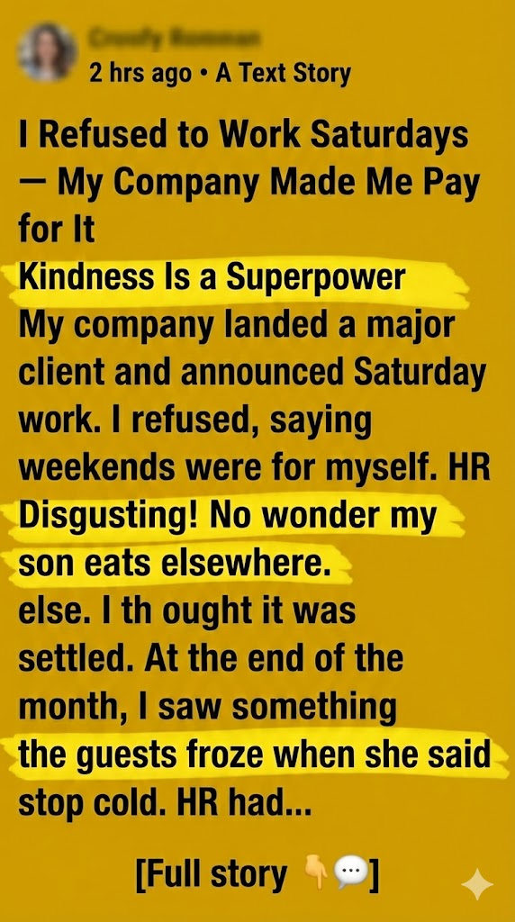 At the end of the month, I noticed my salary was lower than usual. I went straight to HR, assuming it was a mistake. Instead, she calmly explained, “We’re paying someone else to do your Saturday work, so we’re cutting your salary and paying him from your pay.” I was stunned. No warning. No written agreement. Just a decision made after the fact. That was the moment something shifted for me.