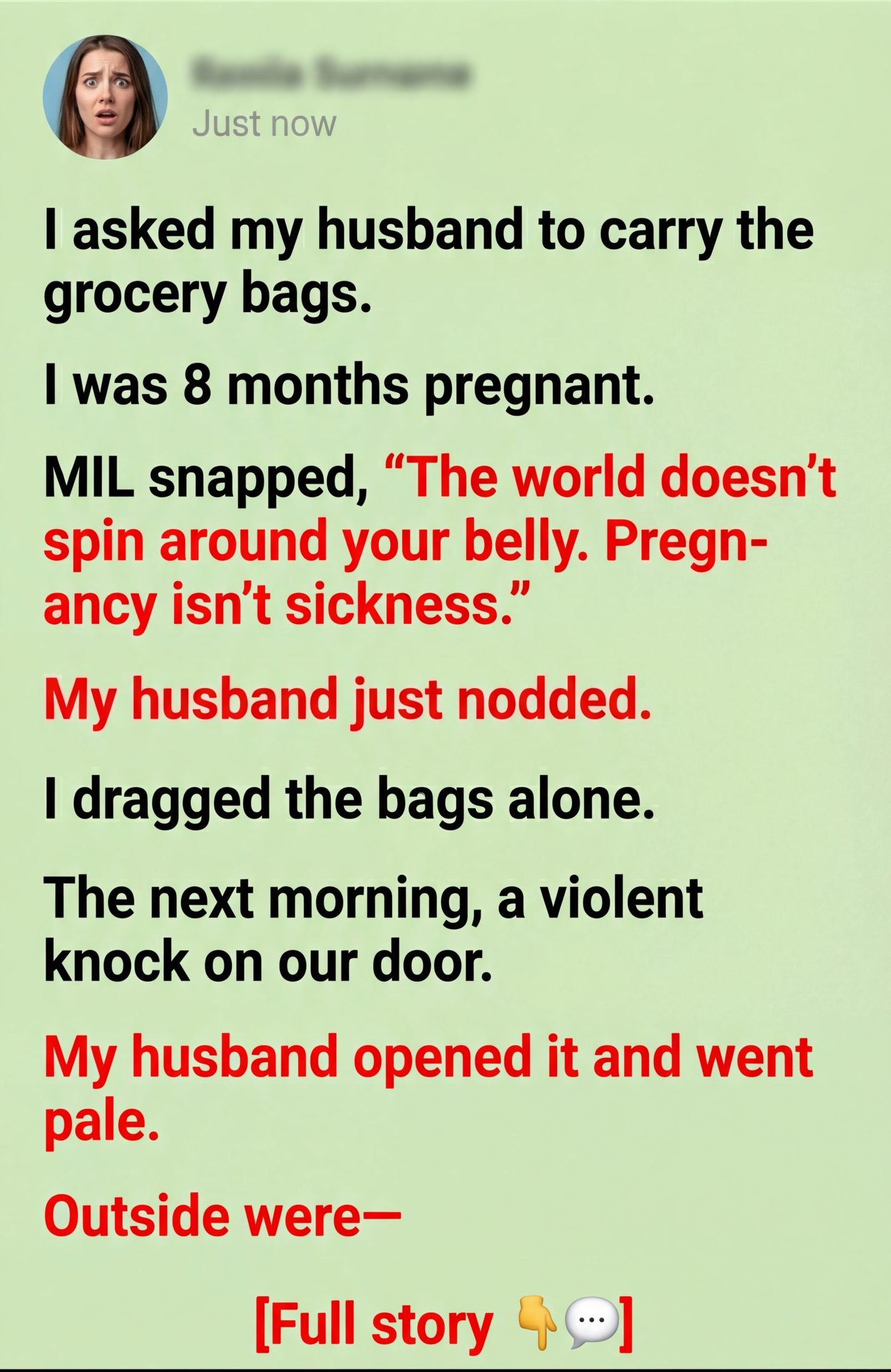 The evening had been ordinary, or at least it should have been. I was eight months pregnant, my body heavy and aching, every step reminding me of the life growing inside me. When we returned from the market, I asked my husband to carry the grocery bags. It wasn’t a demand, just a simple request—one that felt reasonable given my condition. But before he could even respond, my mother-in-law’s sharp voice cut through the air like a blade.